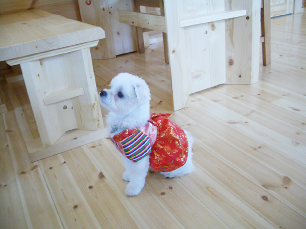 カワイイ装いになりましたねぇ チマチョゴリを着てポーズです。 まるちゃん男の子ですよ〜