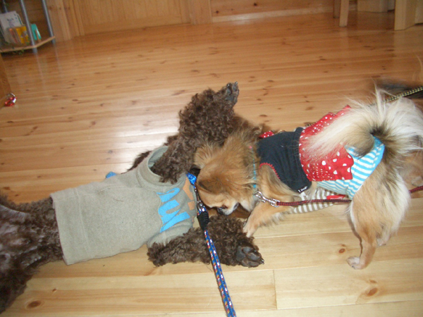 ちっちゃいチワワの女の子 おそろいの服がとてもかわいいね〜